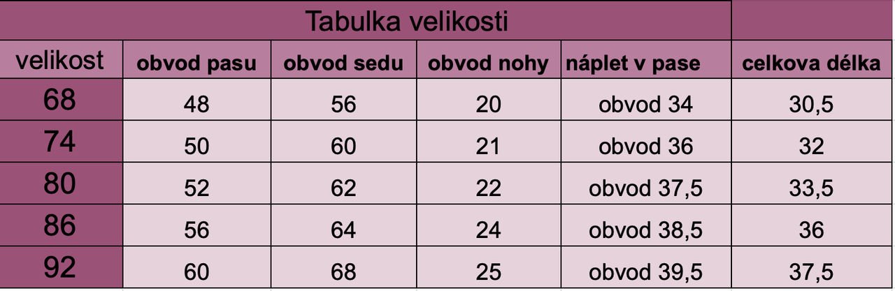 Pohodlné kraťasy jsou příjemné na omak a prodyšné. Kraťasy jsou rostoucí i díky vysokému nápletu v pase, který je 9cm. Náplet je hladký, jemný a velice přizpůsobivý na obvod bříška, tudíž nikde neškrtí, ale zároveň nepadají. Přední a zadní díl jsou stejné. Kraťasy na pleny šijeme, až do velikosti 92.