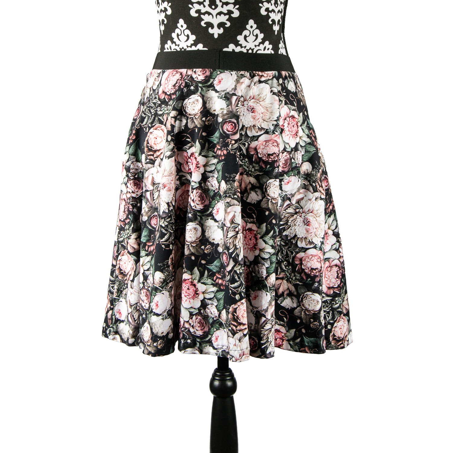 Půlkolová sukně s kapsami – růže na černé/úplet