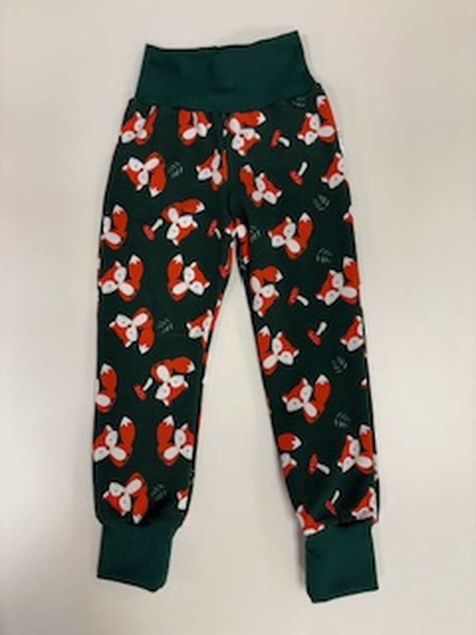 Rostoucí dětské tepláčky – lišky na zelené/teplákovina